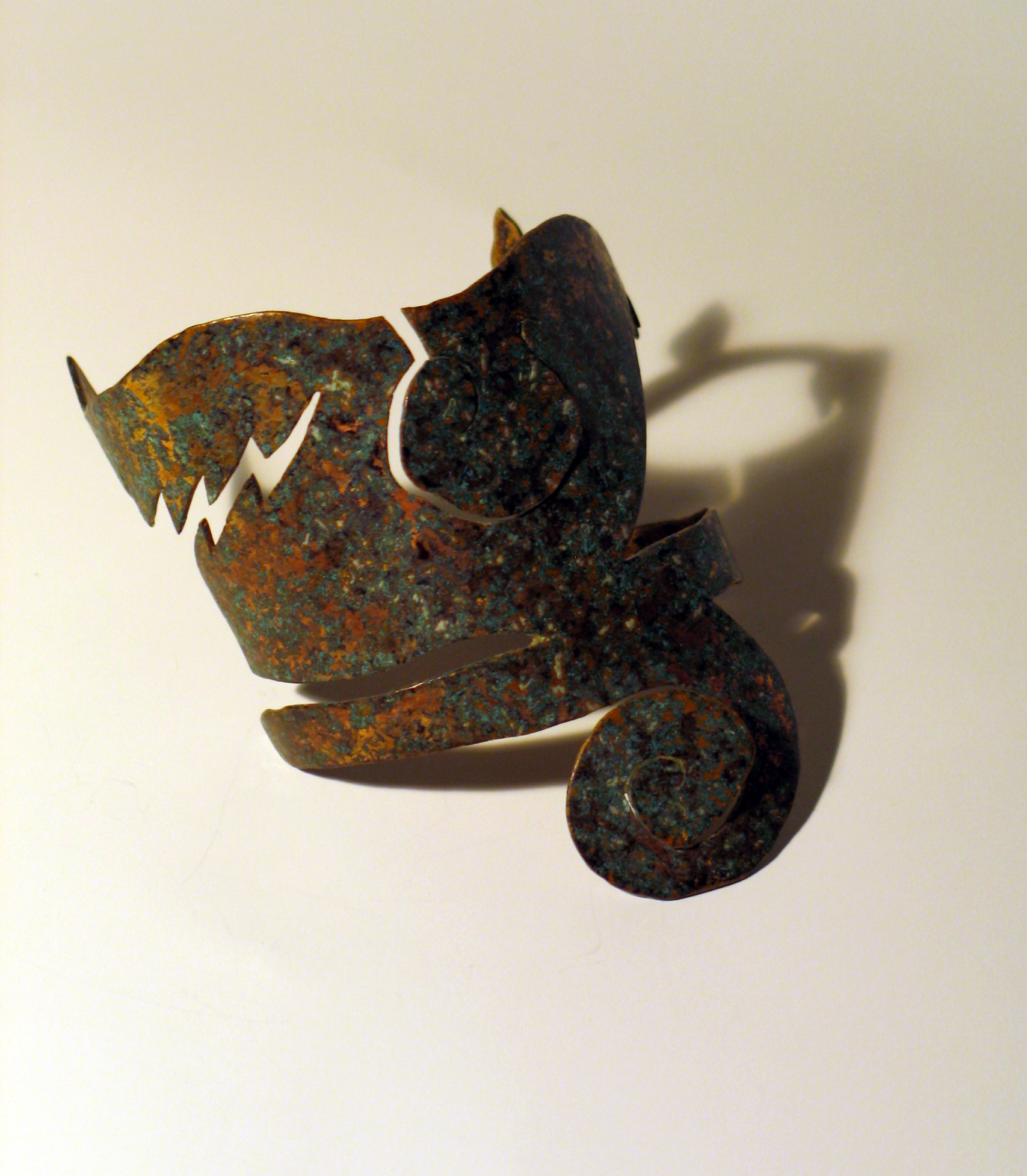 I wanted to use four elements of nature, i.e., earth, wind, water, and fire on this bracelet. I used a jagged line to represent fire, a swirl next to fire for water, a tree branch for earth and another swirl sticking out of the wrist band (bottom on the photo) for wind.