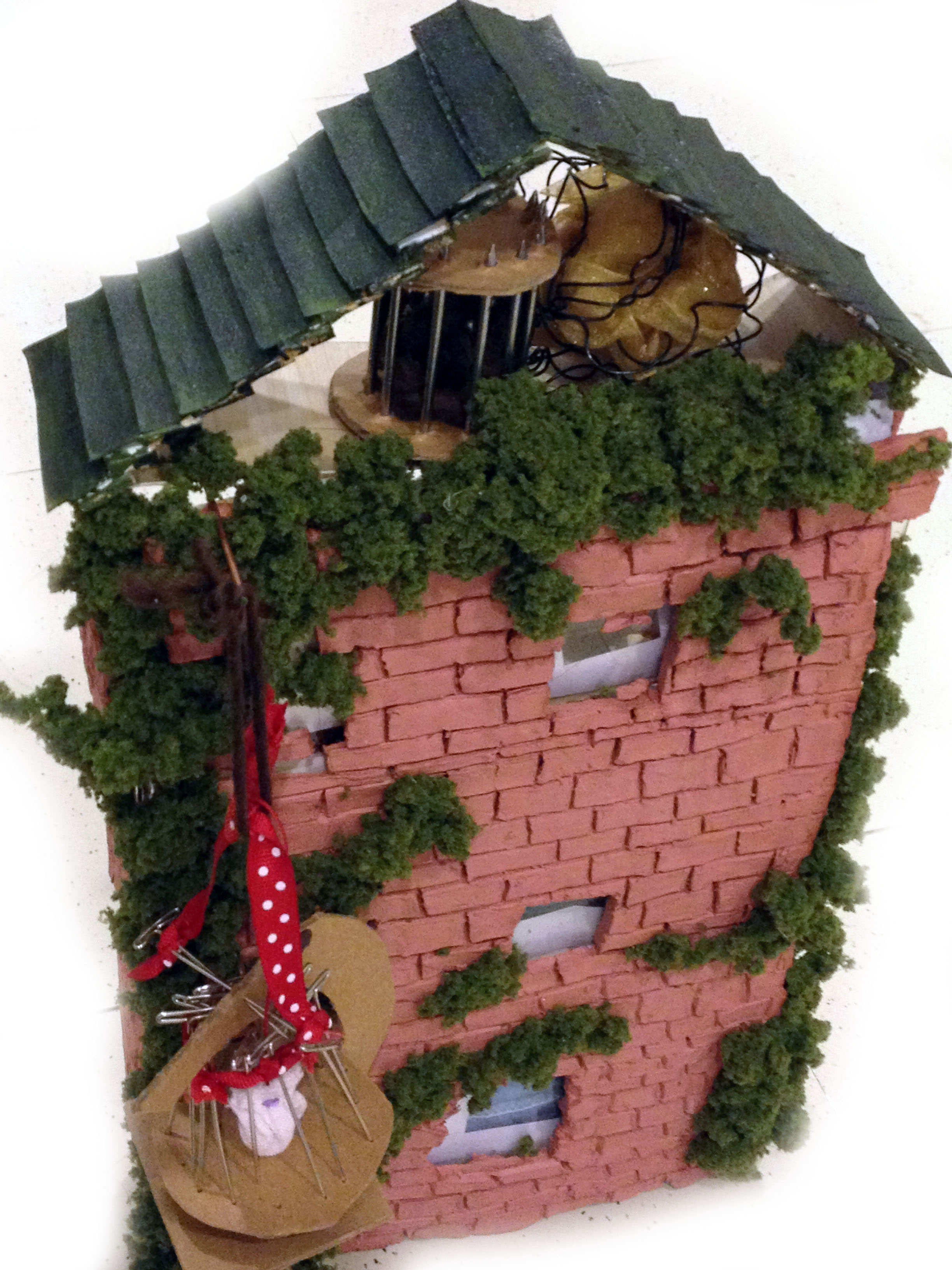 A doll house that is a sort of Frankenstein-ish appearance. The mix mash of different materials (such as clay and wood) create a sense of childishness. This doll house is made using fiber experiments when I had just started to work with fibers. Therefore, this is a Frankenstein dollhouse. Not because this house is a monster, but because of the many elements that are both cohesive and not so cohesive.