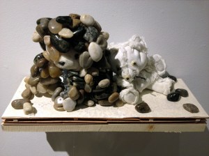 This artwork is a contrast between the cuddly and the not-so-huggable. The one on the left has stones glued onto the surface and the one to the right has been stuffed with stones. This is to represent how some people can be: sometimes they’re not what they first seem to be and sometimes they are.