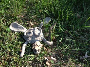 These two little figurines were made on a day a marathon was about to be held in front of the SAIC Columbus building where I was taking a class that day. This was a simple but sweet act of cheering the runners on. This was located near a nearby vegetable garden. The two figures are from a myth about a rabbit, a turtle, and a race.